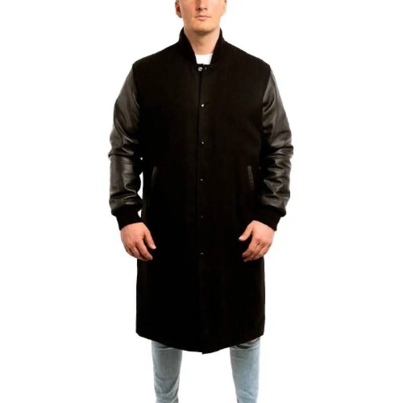 ERedefine your outerwear style with the Black Wool Body & Black Leather Sleeves Letterman Coat—a timeless blend of classic varsity aesthetics and modern minimalism.