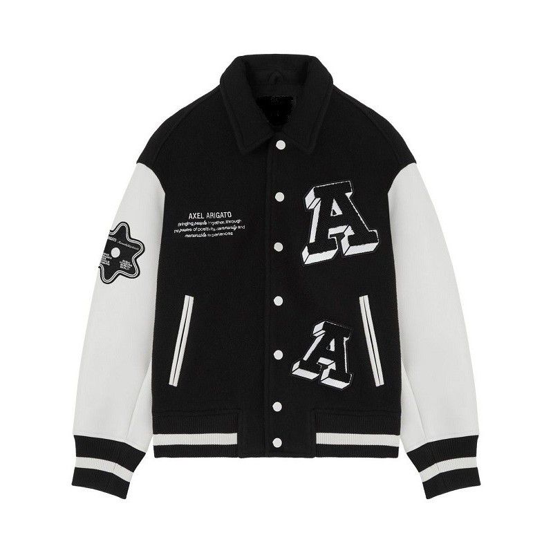 The Snoopy Butter Varsity Jacket features a wool body with genuine leather sleeves in a classic black and white design.
