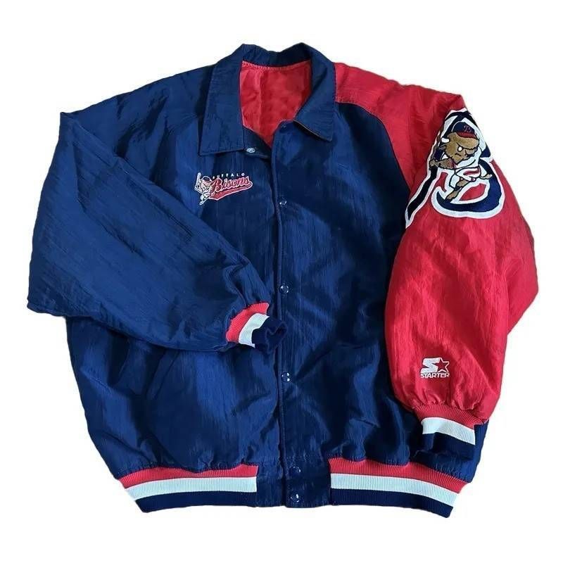 Step back to a classic baseball era. This Buffalo Bisons 90s Blue and Red Satin Jacket authentically captures the decade's iconic color combo and graphics for true minor league nostalgia.