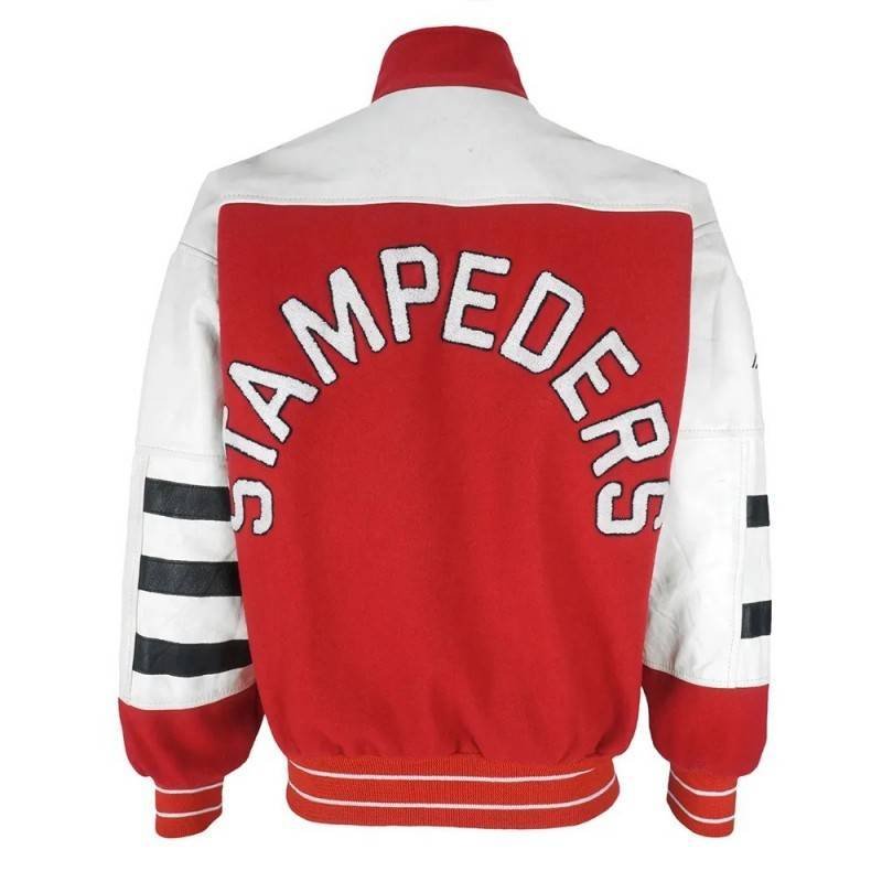 The Calgary Stampeders 1990s Varsity Jacket captures the team's iconic 90s era with authentic colors and vintage detailing. This premium jacket features classic varsity styling that pays homage to the Stamps' CFL legacy. Perfect for game days or showing your team pride, it's a must-have for true Stampeders fans and collectors of retro football memorabilia.