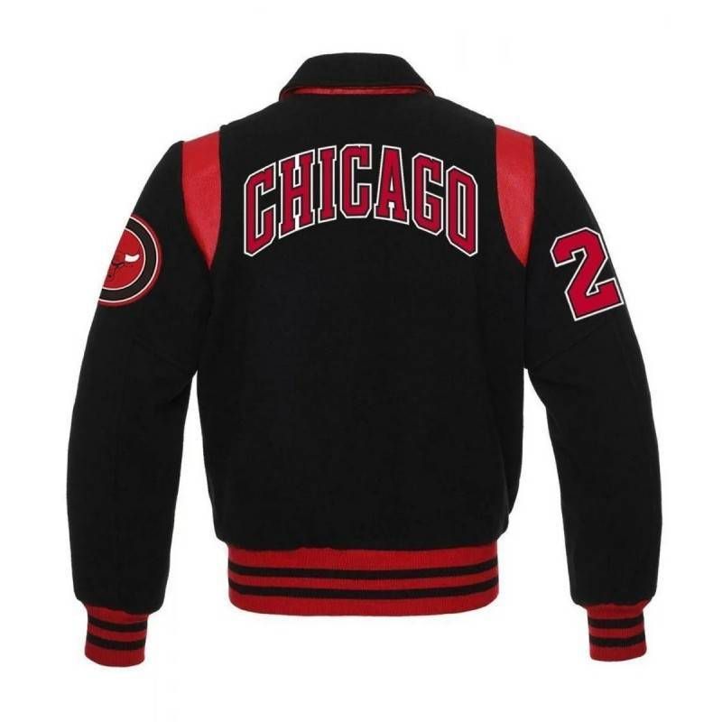 Celebrate the legacy of the Chicago Bulls with this black varsity jacket featuring a stylish sailor collar – a perfect blend of sports history and street-ready fashion.