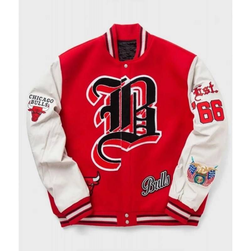 Own a piece of Bulls history with this Red Wool & White Leather Varsity Letterman Jacket, featuring premium materials and authentic team branding for die-hard fans.