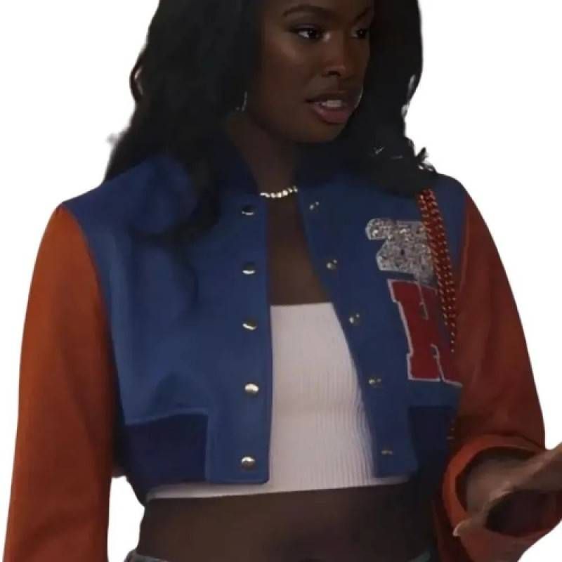 The Coco Jones Bel Air S03 Crop Varsity Jacket captures the chic, modern style of Hilary Banks as portrayed by Coco Jones in the Peacock series "Bel-Air." This crop varsity jacket blends athletic inspiration with contemporary fashion, featuring tailored details and trendy design elements. Perfect for fans of the show, streetwear enthusiasts, or anyone looking to make a stylish statement, it embodies the confidence and sophistication of the character. This jacket is a must-have for those who appreciate pop culture-inspired apparel with a fresh, urban edge.