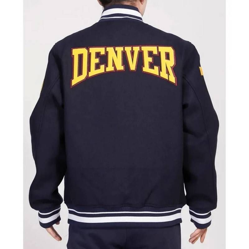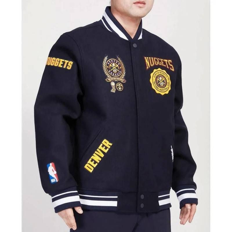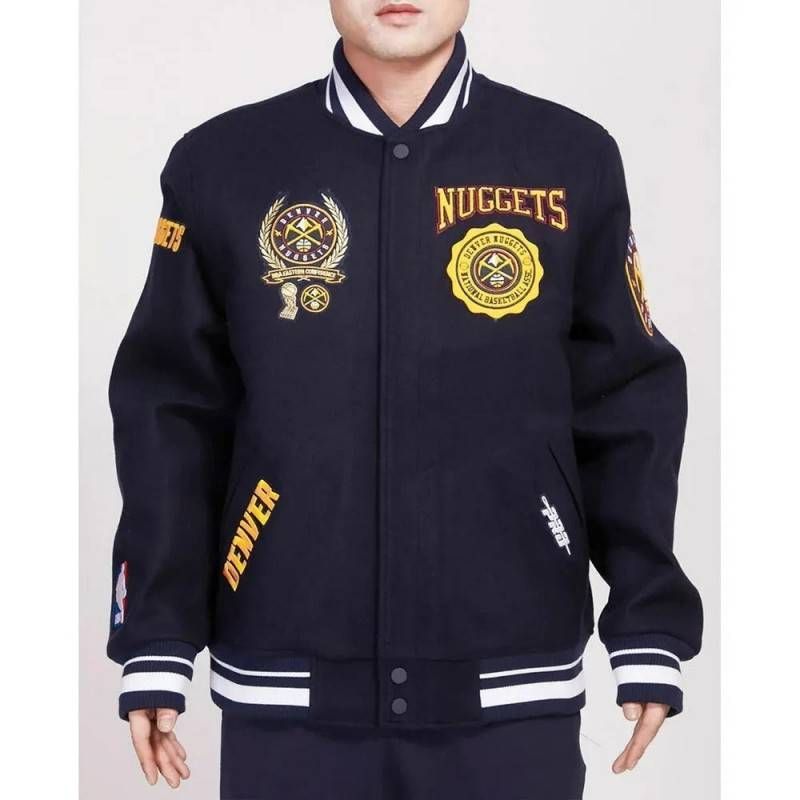 Show your NBA pride with the Denver Nuggets Crest Emblem Navy Varsity Wool Jacket, a timeless piece celebrating the team’s legacy and iconic emblem design.