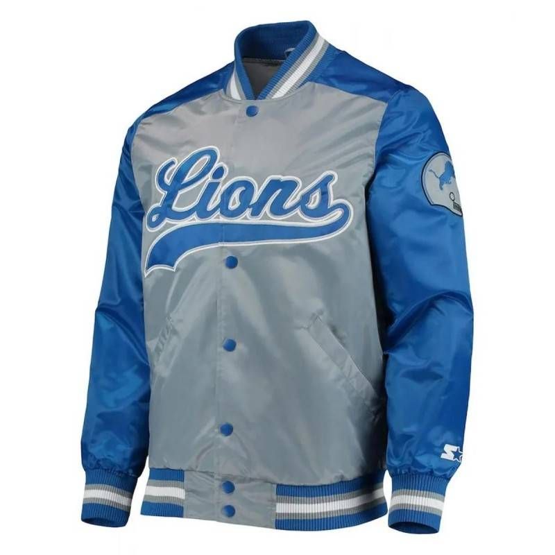 Celebrate Detroit football pride with the Lions The Tradition II Grey and Blue Varsity Satin Jacket, a timeless tribute to the team’s rich NFL legacy.