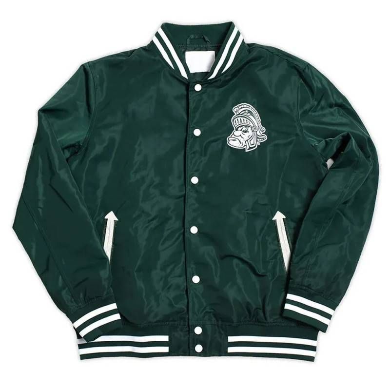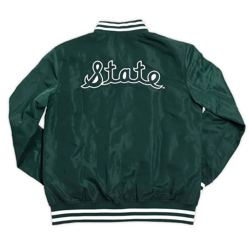 Rep your Spartans pride like Drake in this Michigan State Script Bomber Jacket, featuring the iconic green and white university colors and official team typography. Perfect for game days or streetwear fashion.
