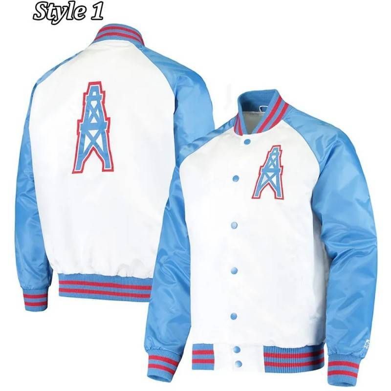 The Houston Oilers White Varsity Jacket celebrates the legacy of the legendary NFL team. Designed for both fans and collectors, this jacket combines vintage style with a nod to Houston’s football history. Its timeless white design and classic varsity aesthetic make it a standout piece for game days, casual outings, or adding to a sports memorabilia collection