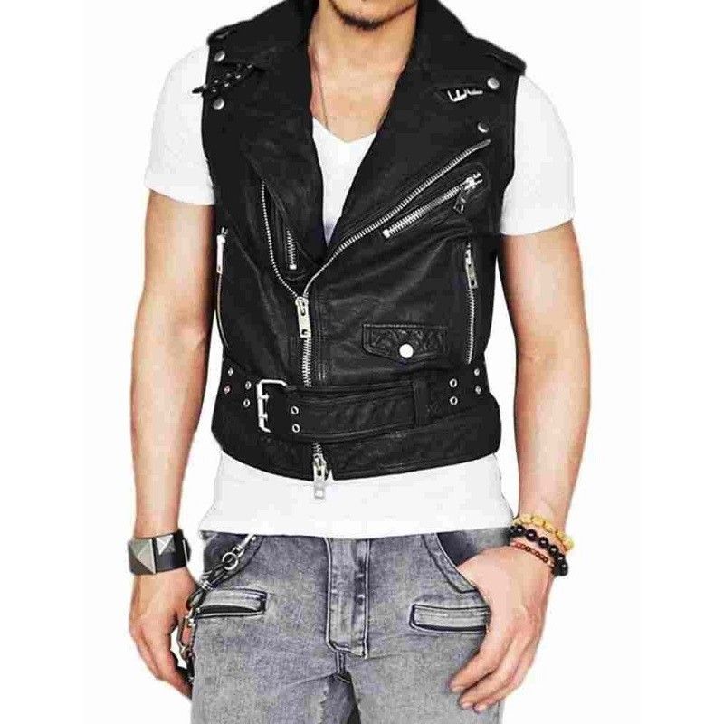 Mens Belted Asymmetrical Black Zipper Leather Vest