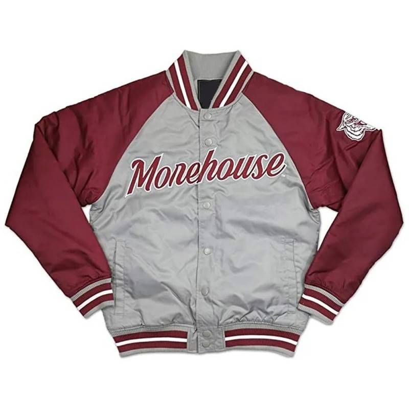 Lightweight satin varsity jacket featuring Morehouse embroidery, maroon sleeves, and college pride from front to back. A sleek and stylish tribute to the Maroon Tigers legacy.