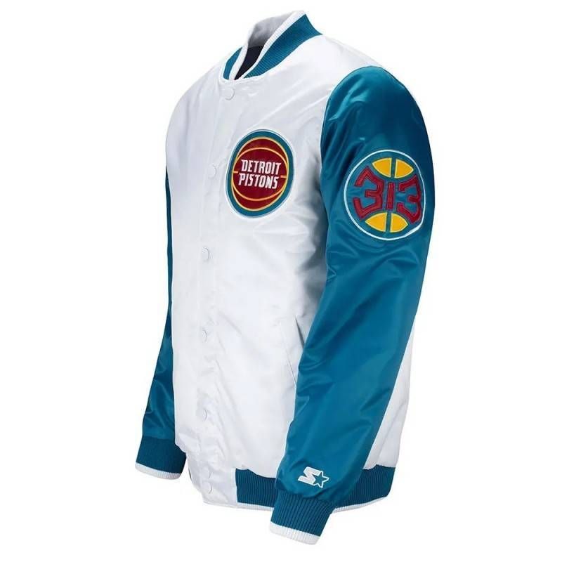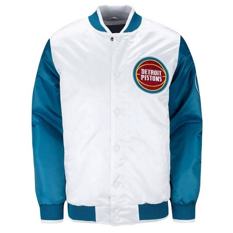 Celebrate Detroit basketball heritage with the Pistons Ty Mopkins Teal and White Satin Jacket — a bold tribute to retro NBA fashion and classic team colors.