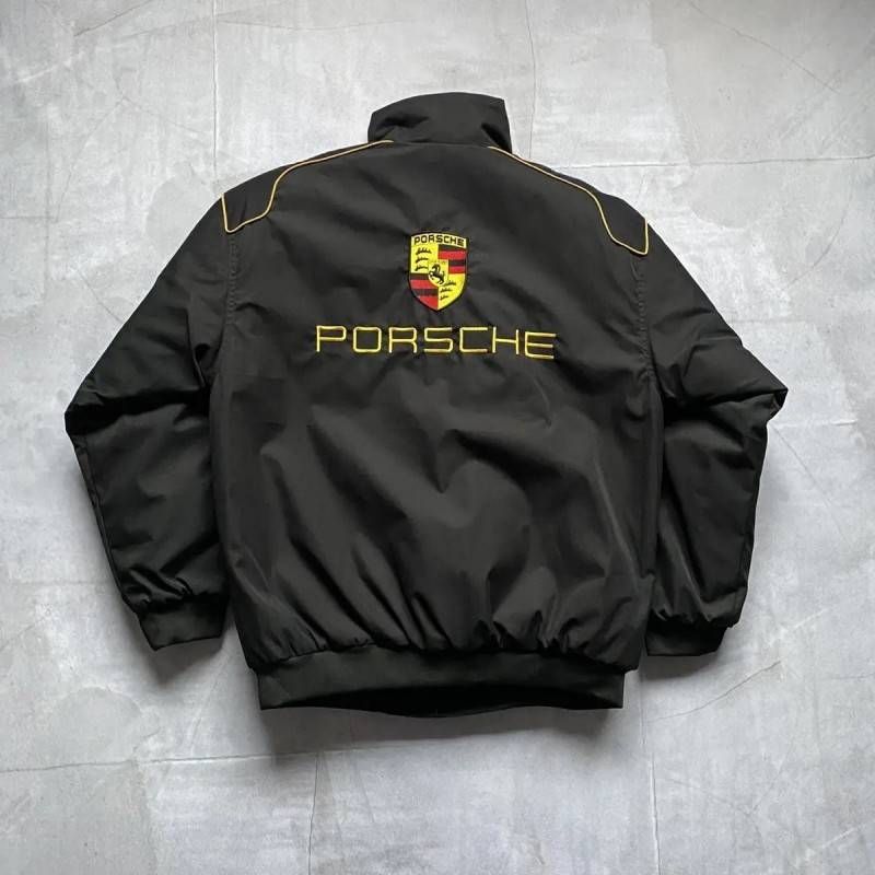 The Porsche Big Logo Black Bomber Racing Jacket embodies the spirit of German motorsport engineering with its bold Porsche branding and sleek black design. This premium jacket pays homage to Porsche's legendary racing history, making it perfect for car meets, casual wear, or displaying your Porsche passion. The standout crest logo and classic bomber silhouette create a timeless look that appeals to both motorsport enthusiasts and fashion-forward individuals.