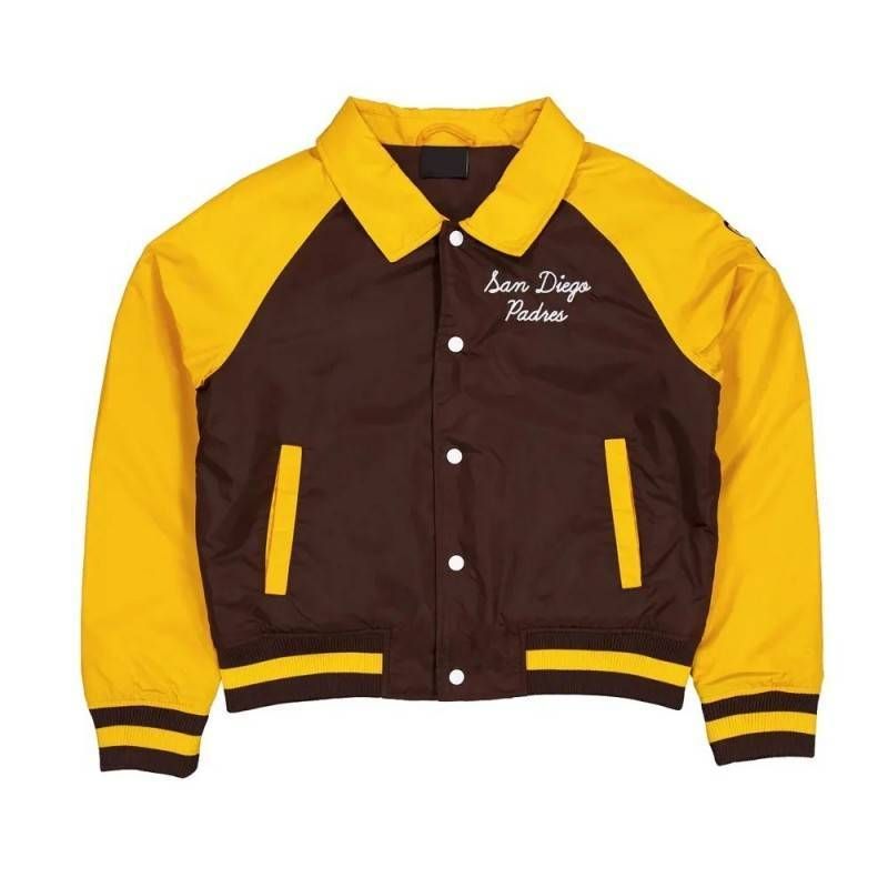 For both genders Inspired by baseball team: San Diego Padres Material: Nylon Inner: Viscose lining Color: Brown and gold Collar: Shirt style Front: Snap tab closure Sleeves: Long sleeves with patch Cuffs: Rib knitted Pockets: Two slanted waist pockets, one inner pocket Hemline: Rib knitted Logo: Embroidered logo on back, “Chicago Bulls” lettering are featured on chest and back Superb stitching