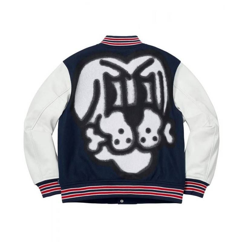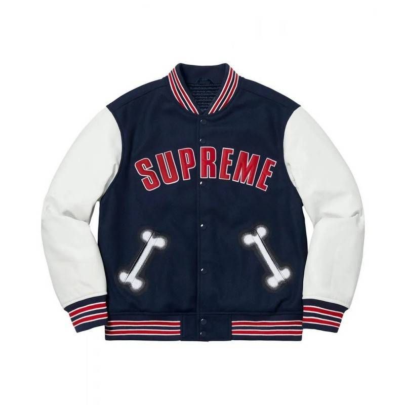Elevate your streetwear game with the Supreme Bone Navy Blue Letterman Varsity Jacket, blending classic varsity style with modern Supreme aesthetics. Perfect for collectors and fashion enthusiasts alike
