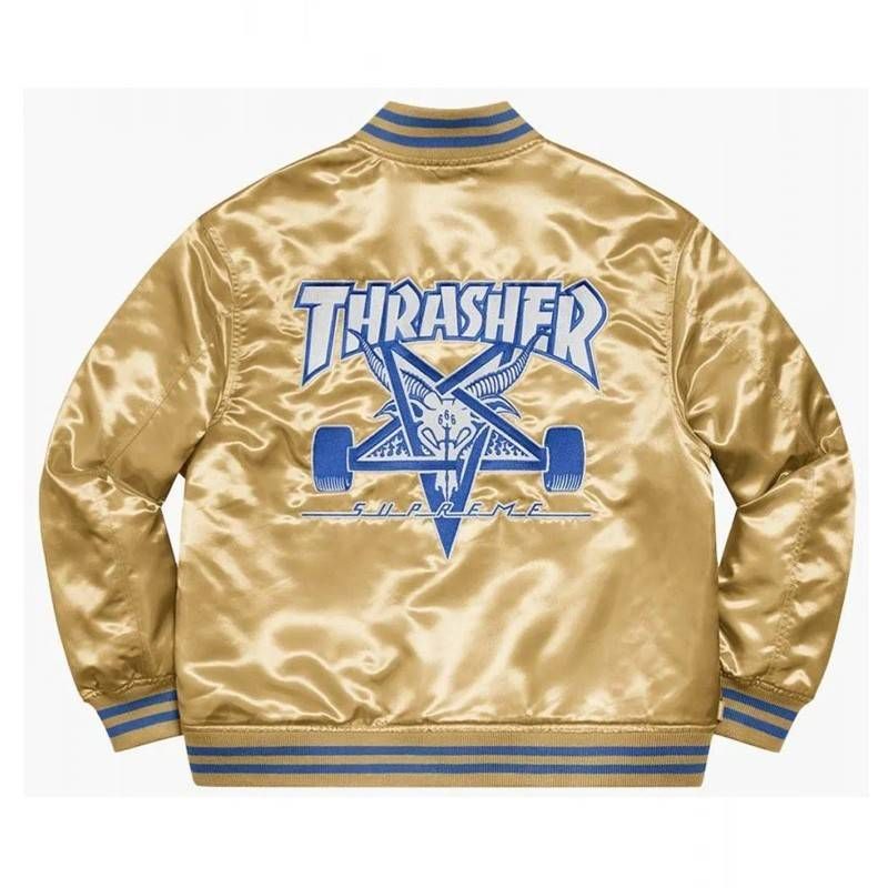 Elevate your streetwear collection with the Supreme Thrasher Bomber Jacket in golden satin. A perfect blend of style and skate culture history, this jacket represents iconic fashion collaborations