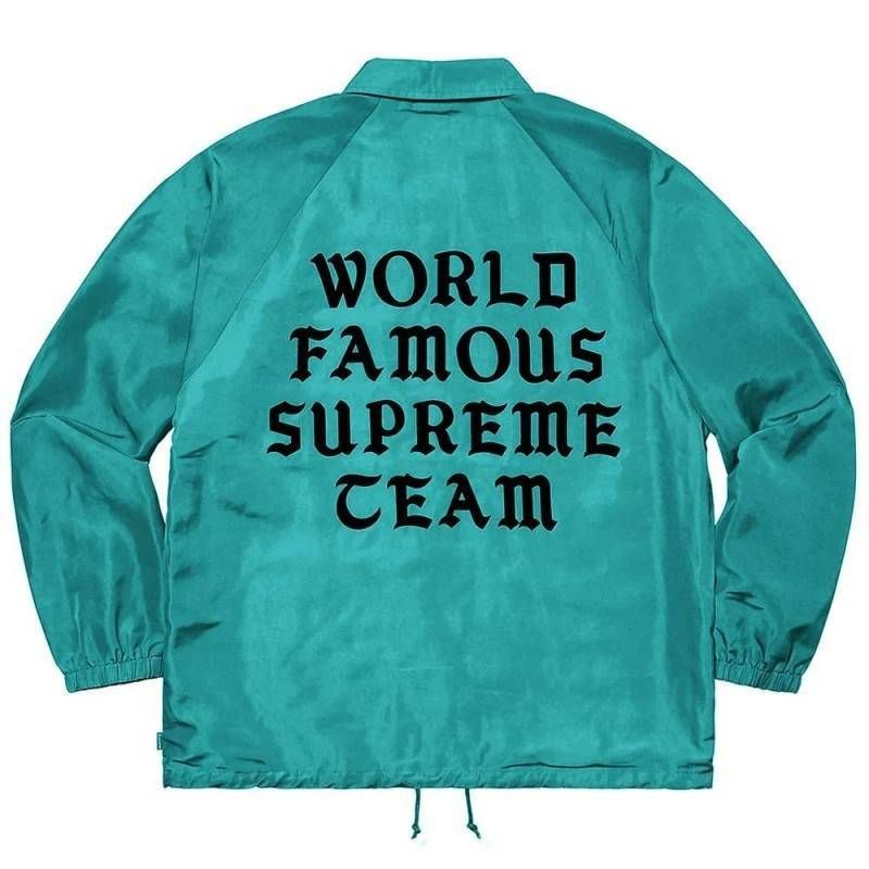 The Supreme World Famous Aqua Coaches Jacket delivers a fresh streetwear statement with a vibrant aqua color and Supreme’s globally recognized identity.