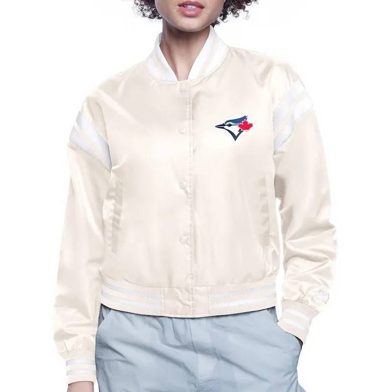 Make a sharp, clean statement. This White Toronto Blue Jays Printed Logo Varsity Satin Jacket features bold team graphics on a bright white satin varsity silhouette for standout fan style.