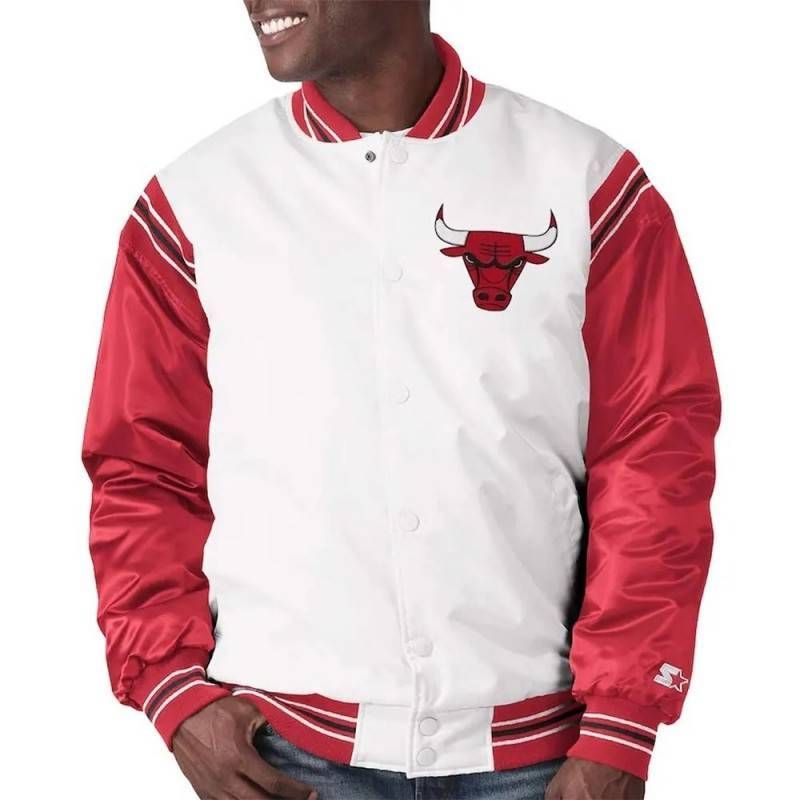 The White/Red Chicago Bulls Renegade Varsity Satin Jacket captures the essence of 90s NBA style while offering a modern streetwear twist. Designed for fans and collectors, it celebrates the Chicago Bulls’ legendary history and iconic team spirit.